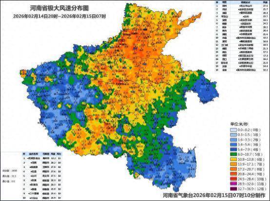 大河网讯(记者 莫韶华)2月15日,据河南省气象台监测数据显示,2月14日20时至15日7时,我省北中部、西南部出现6到8级大风,局地9到11级。风速前三站分别为:禹州市无梁卧龙山32.2米/秒(11级)、辉县市河西28.2米/秒(10级)、卫辉市抵鹿泉27.9米/秒(10级)。