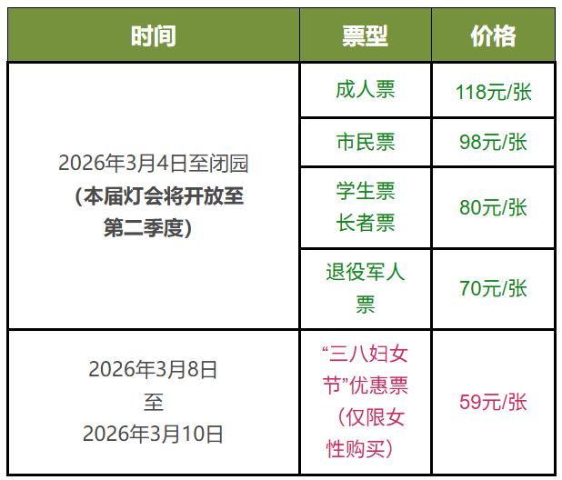 2026年3月4日至闭园(本届灯会将开放至第二季度)\t,成人票118元/张;市民票98元/张;学生票、长者票80元/张;退役军人票70元/张。2026年3月8日至2026年3月10日,“三八妇女节”优惠票(仅限女性购买)59元/张。