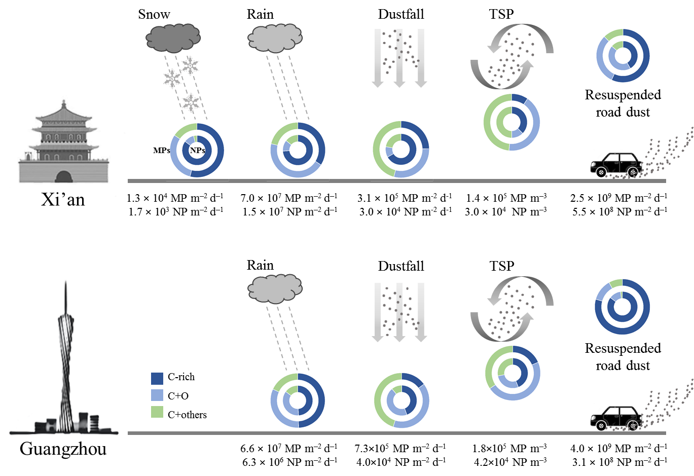△城市大气微塑料和纳米塑料丰度、通量与组成示意图