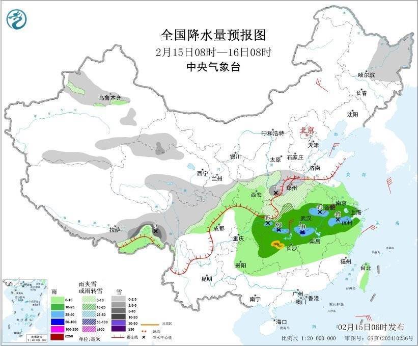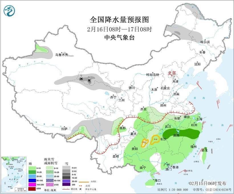 图5 全国降水量预报图(2月15日08时-16日08时)
